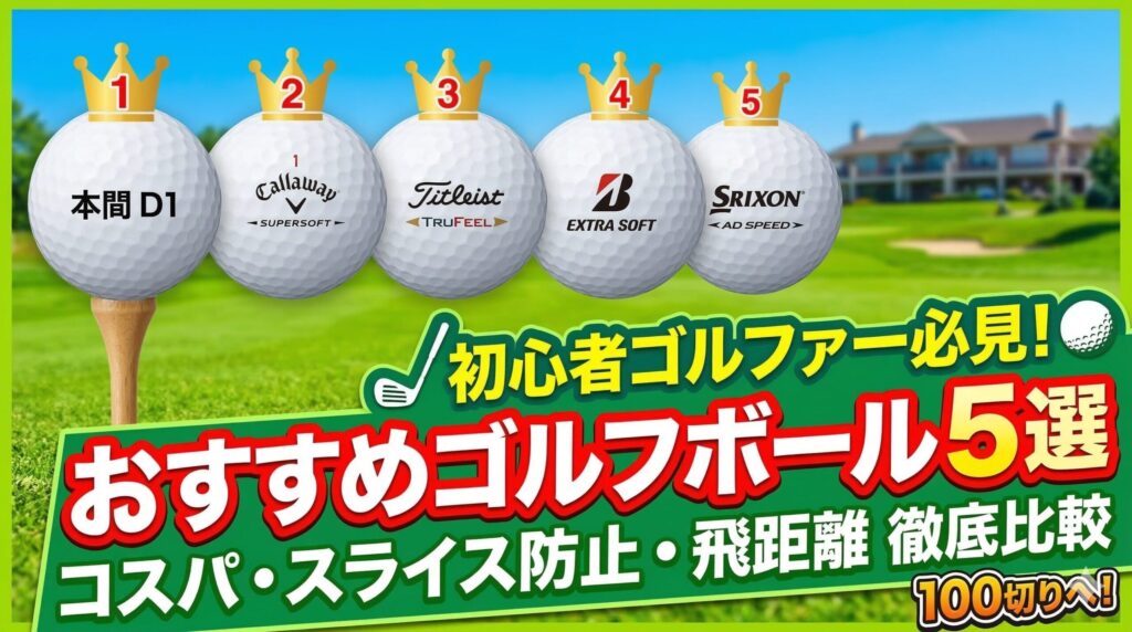 そんなお悩みはありませんか? この記事では、100切りを目指す初心者ゴルファーに向けて、「お財布に優しい(コスパ最強)」「スライスしにくい」「飛距離が出る」という3つの条件を満たしたおすすめのゴルフボールを5つ厳選してランキング形式で紹介します!